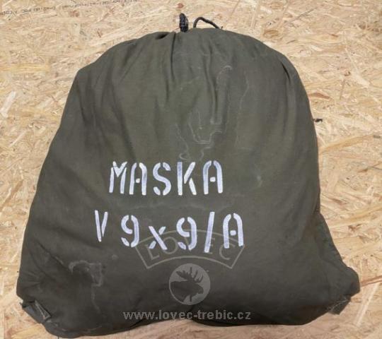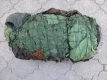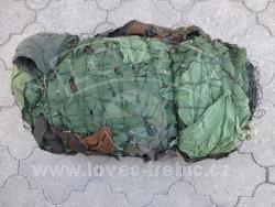 Látková maskovací síť. Síť je tvořena přišitými čtverci a pruhy látky na silonovém sítěném podkladu. Použité, dlouhodobě skladované zboží.
