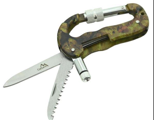 Multifunkční nůž / karabina KAMU 3v1 s LED svítilnou a nástroji z nožířské oceli. Užitečný pomocník pro camping, rybaření a další outdoor využití.