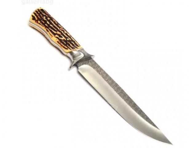 Velký lovecký nůž se širokou čepelí a rohovinou/polymer/. Délka čepele 18,0 cm. Délka celého nože 31,0 cm